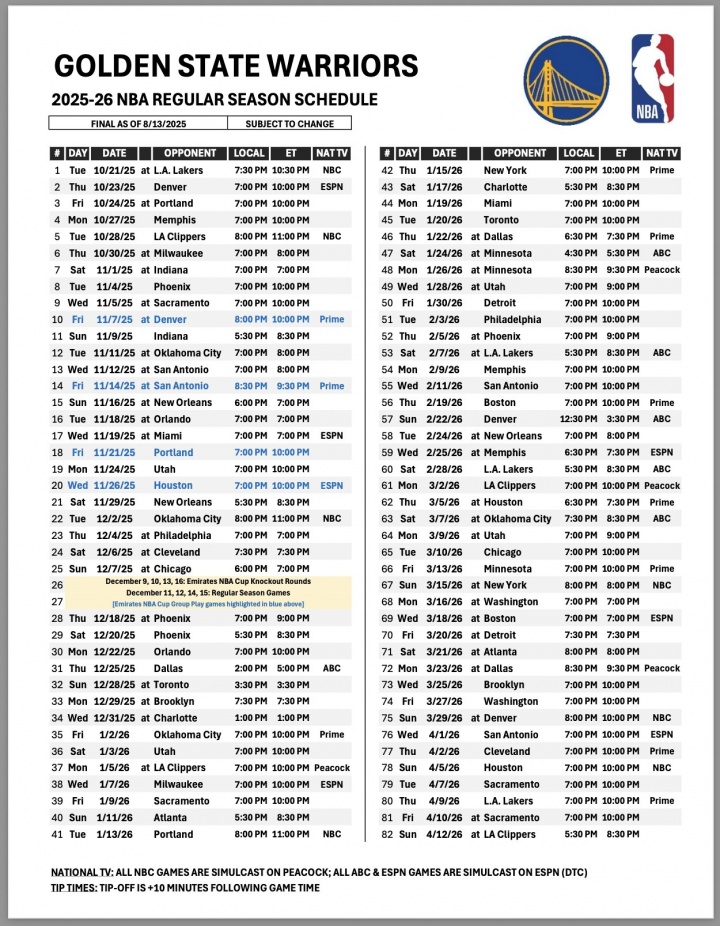 勇士新赛季赛程:揭幕战VS湖人 圣诞大战VS独行侠 34场全美直播